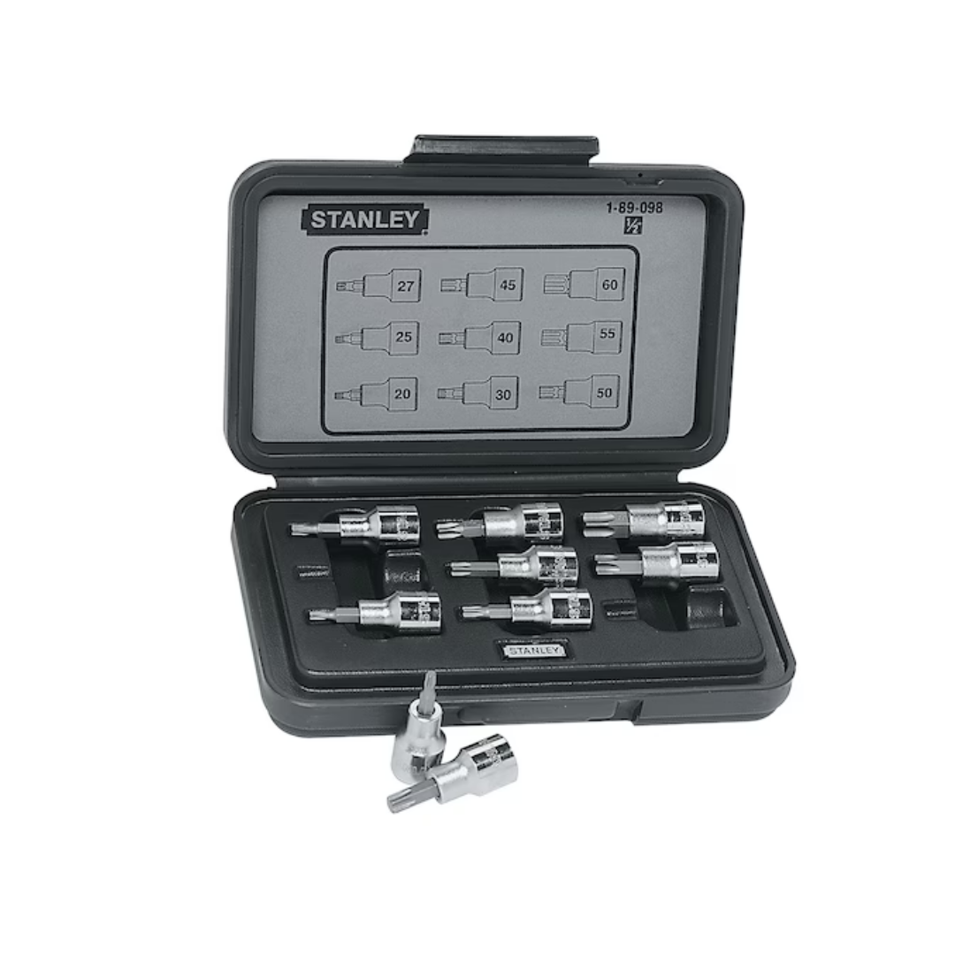 Juego de 9 copas con puntas Torx de mayor tamaño, desde T20 hasta T60, con encastre de 1/2″. Permiten aplicar un torque superior para tornillos Torx de alto rendimiento, comunes en frenos y transmisiones.
