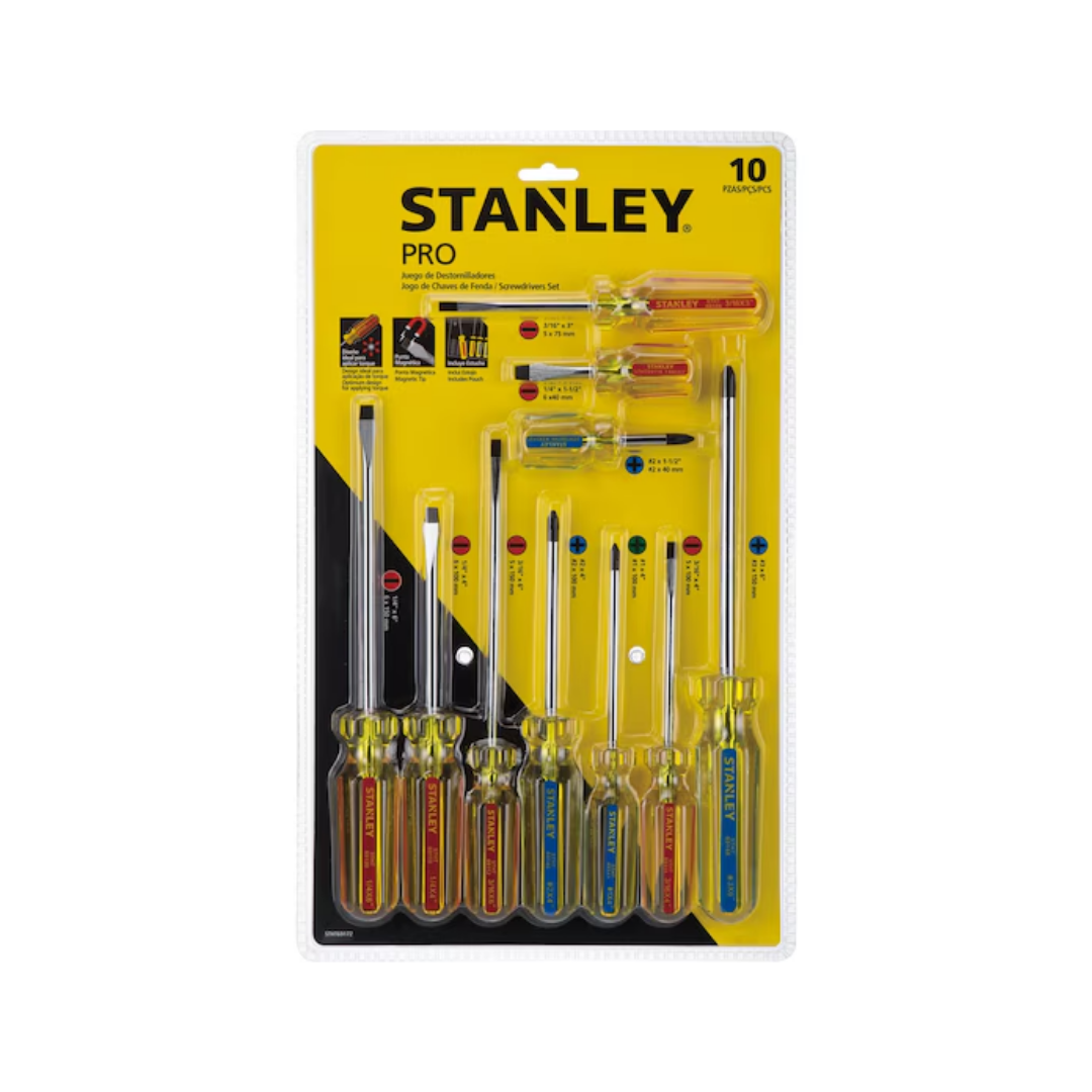 Set completo de 10 destornilladores profesionales, cubriendo todos los tamaños y tipos esenciales. La elección del experto para cualquier tarea que requiera herramientas fiables y de alto rendimiento.