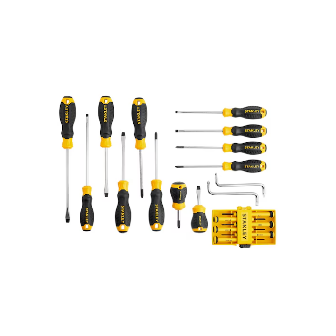 El kit más extenso con 20 destornilladores planos y Phillips, incluyendo tamaños de precisión y puntas especializadas. Ofrece una solución completa y económica para cualquier necesidad de atornillado.