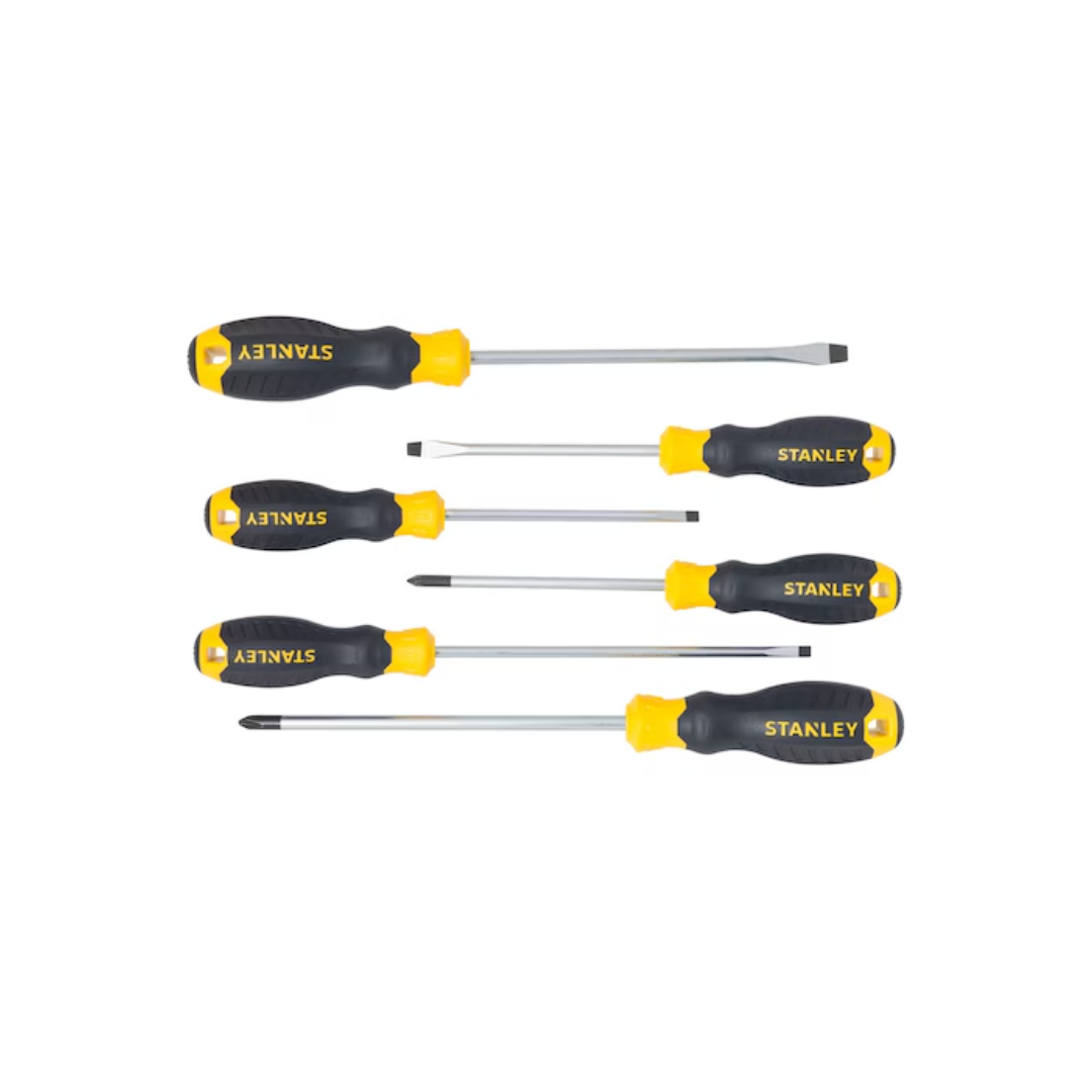 Set de 6 destornilladores que incluye puntas planas y Phillips (estrella) en los tamaños más utilizados. Opción económica y práctica para tareas domésticas y de ensamblaje ligero.