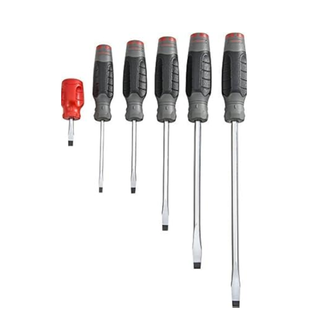 Este juego incluye 6 destornilladores de pala (plano) con diferentes tamaños, ideales para múltiples tareas mecánicas, eléctricas e industriales. Fabricados en acero de alta resistencia y con mango ergonómico antideslizante, brindan comodidad, torque y precisión en cada uso. Las puntas están reforzadas para evitar desgaste prematuro y asegurar una larga vida útil.