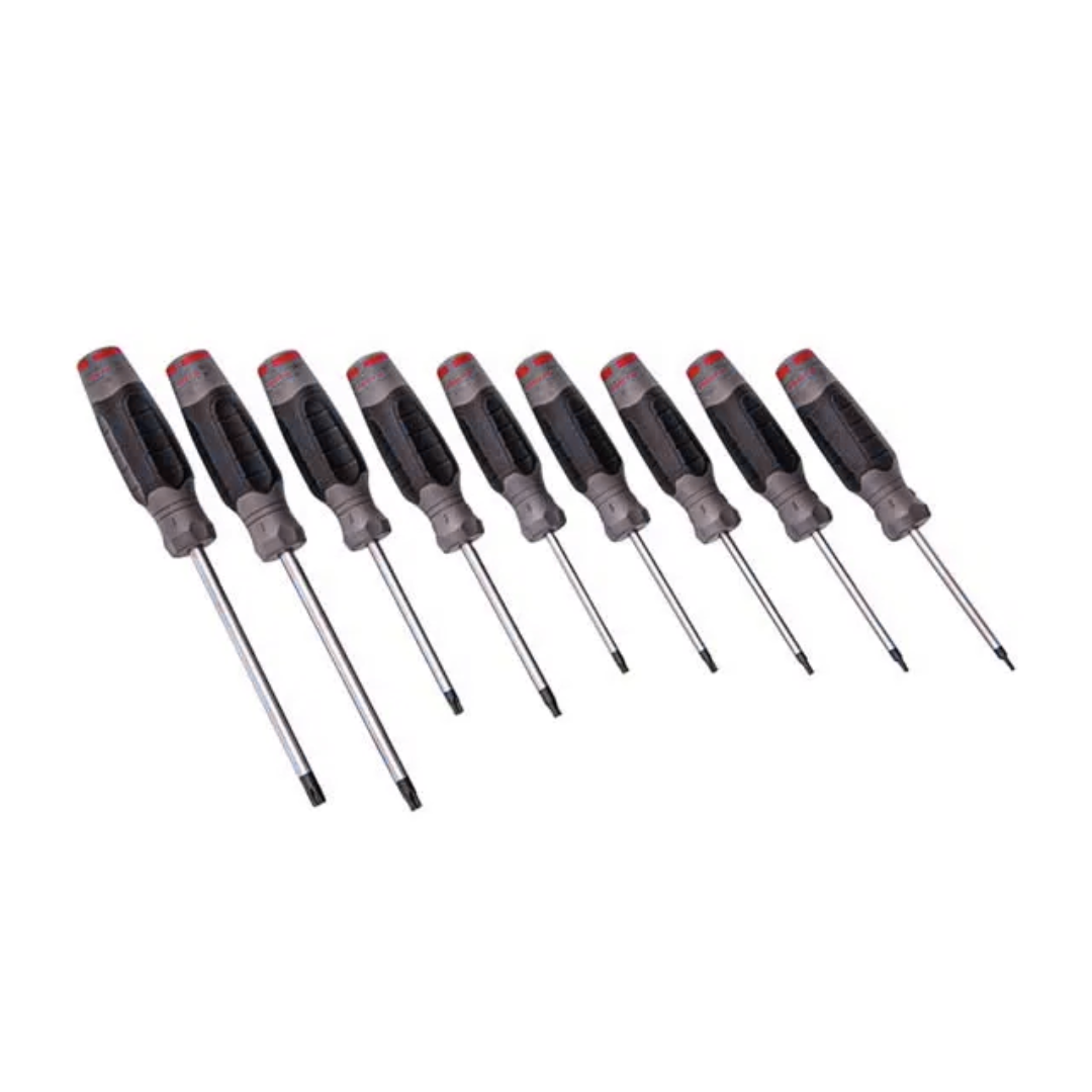 Este juego incluye 9 destornilladores con puntas Torx de tamaños T8 a T45, diseñados para ajustar y aflojar tornillos tipo estrella de forma segura y precisa. Fabricados en acero de alta calidad, ofrecen gran durabilidad y resistencia al desgaste. Su mango ergonómico brinda comodidad durante el uso prolongado, ideal para trabajos en electrónica, automotores, electrodomésticos y maquinaria.