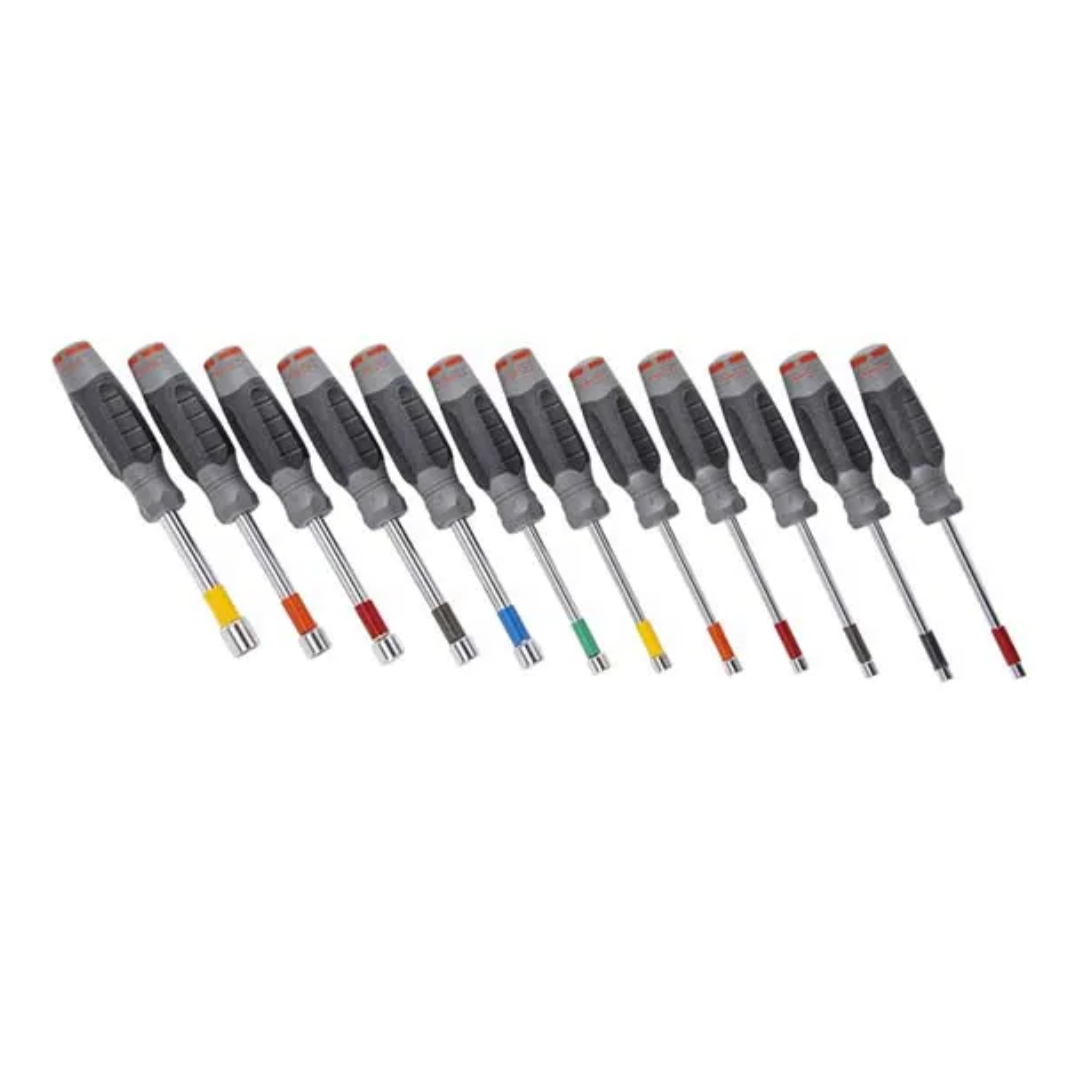Este completo set incluye 12 destornilladores para tuercas con medidas de 4 a 14 mm, ideales para tareas de montaje, mantenimiento y mecánica liviana. Fabricados en acero de alta calidad, brindan resistencia y durabilidad, mientras que sus mangos ergonómicos permiten un agarre cómodo y seguro. Perfectos para trabajar en espacios reducidos y lograr ajustes precisos sin dañar las superficies.